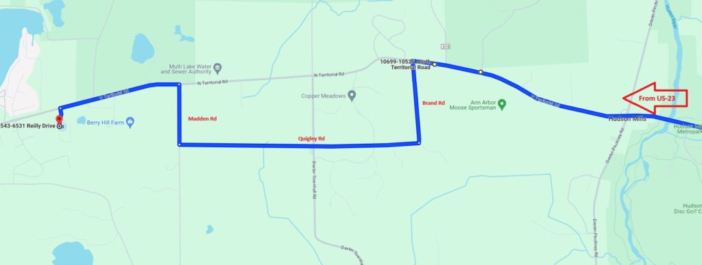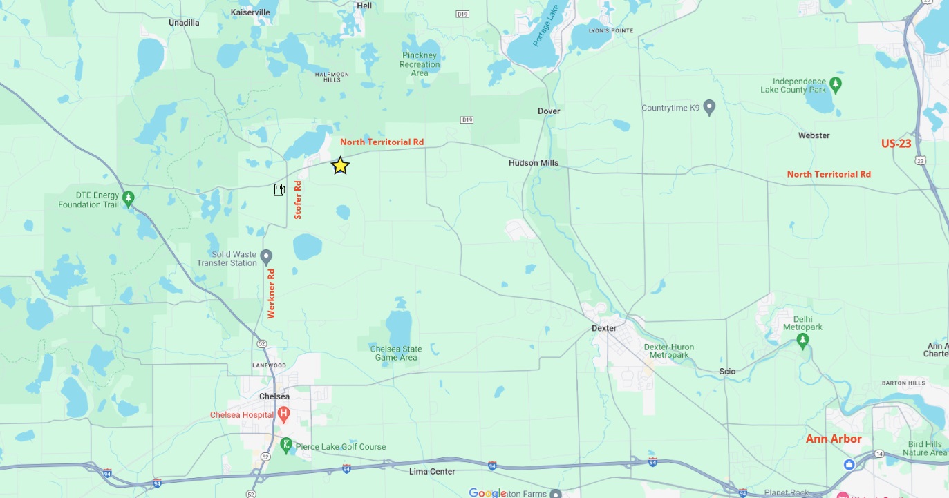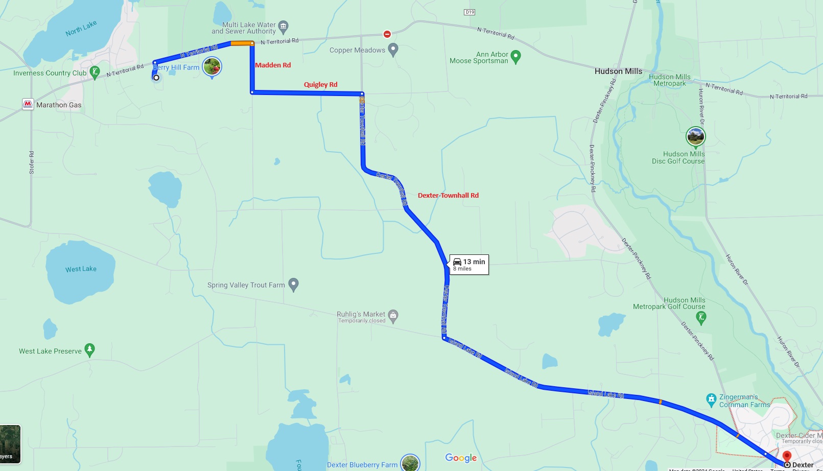 - Go West on North Territorial (there will be a couple of round-abouts) for around 10 miles (you can continue west past the Dexter-Pinkney Rd intersection even though it says closed to through traffic)